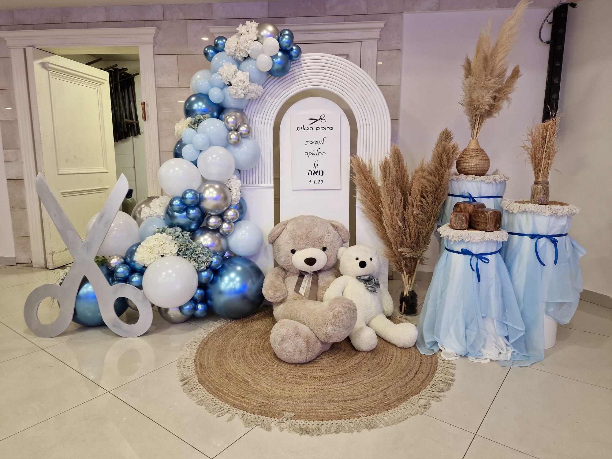 קיר צילום בלונים בצבעי כחול לבן וזהב לבר מצווה